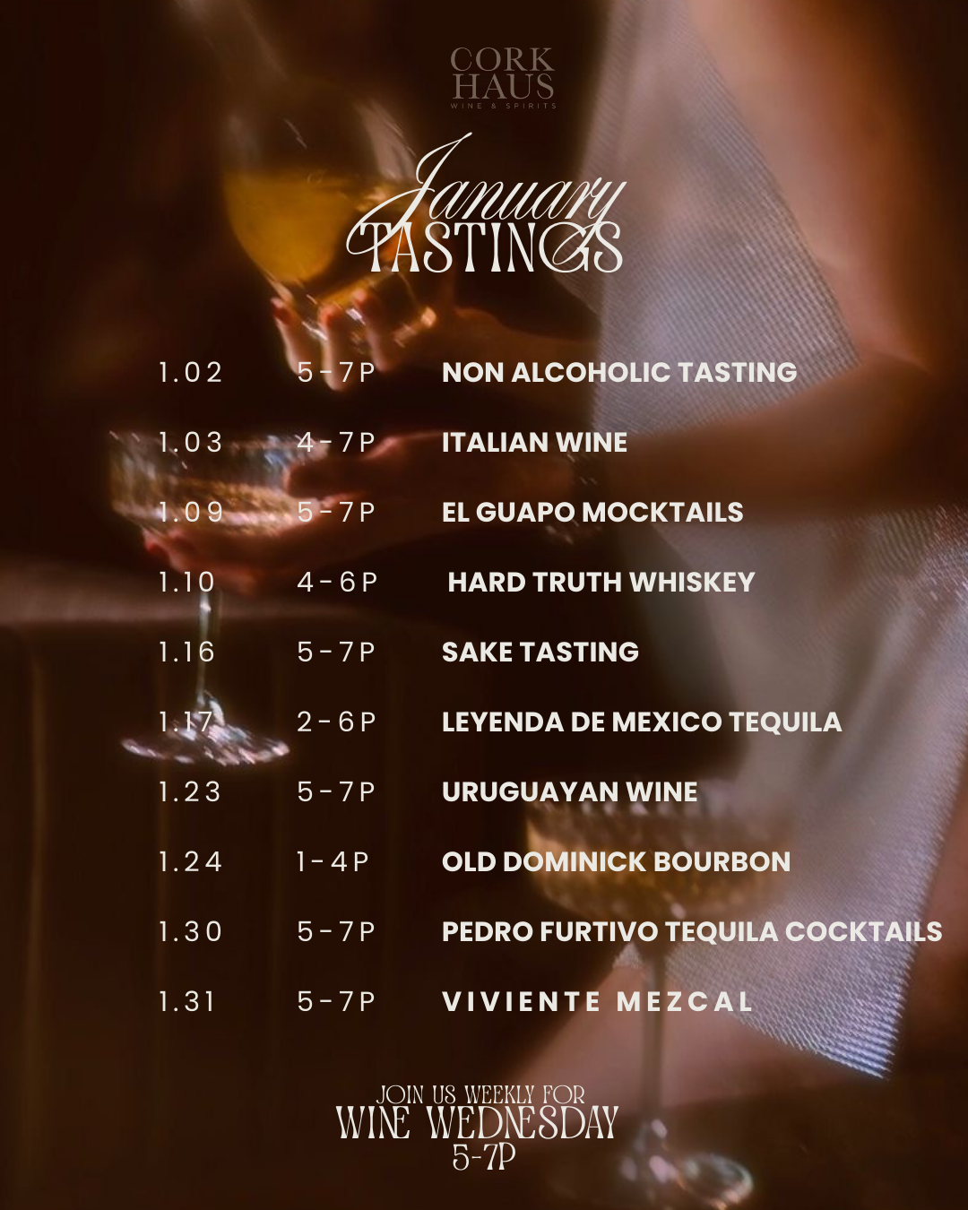 Our Tasting lineup is here! Complimentary Tastings all January long - All curated with love. Can’t wait to see you! • • • No RSVP required! See you soon!Button
